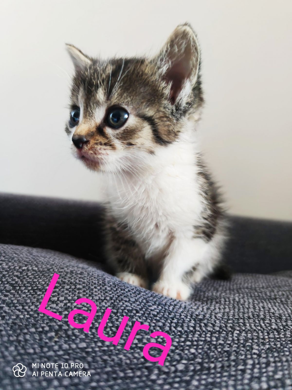 Laura je typické dvouměsíční koťátko - hravé, aktivní, s chutí prozkoumávat svět. Je mazlivá, přátelská, vhodná do rodiny s dětmi a jinými zvířaty. Na záchodek chodit umí.