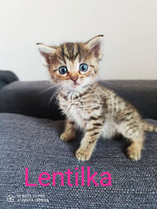 Lentilka je typické dvouměsíční koťátko - hravé, aktivní, s chutí prozkoumávat svět. Je mazlivá, přátelská, vhodná do rodiny s dětmi a jinými zvířaty. Na záchodek chodit umí.