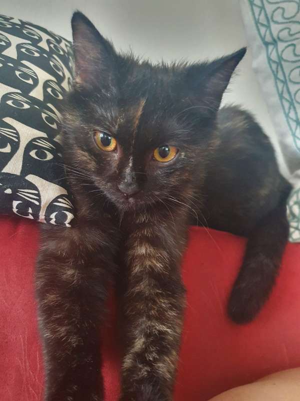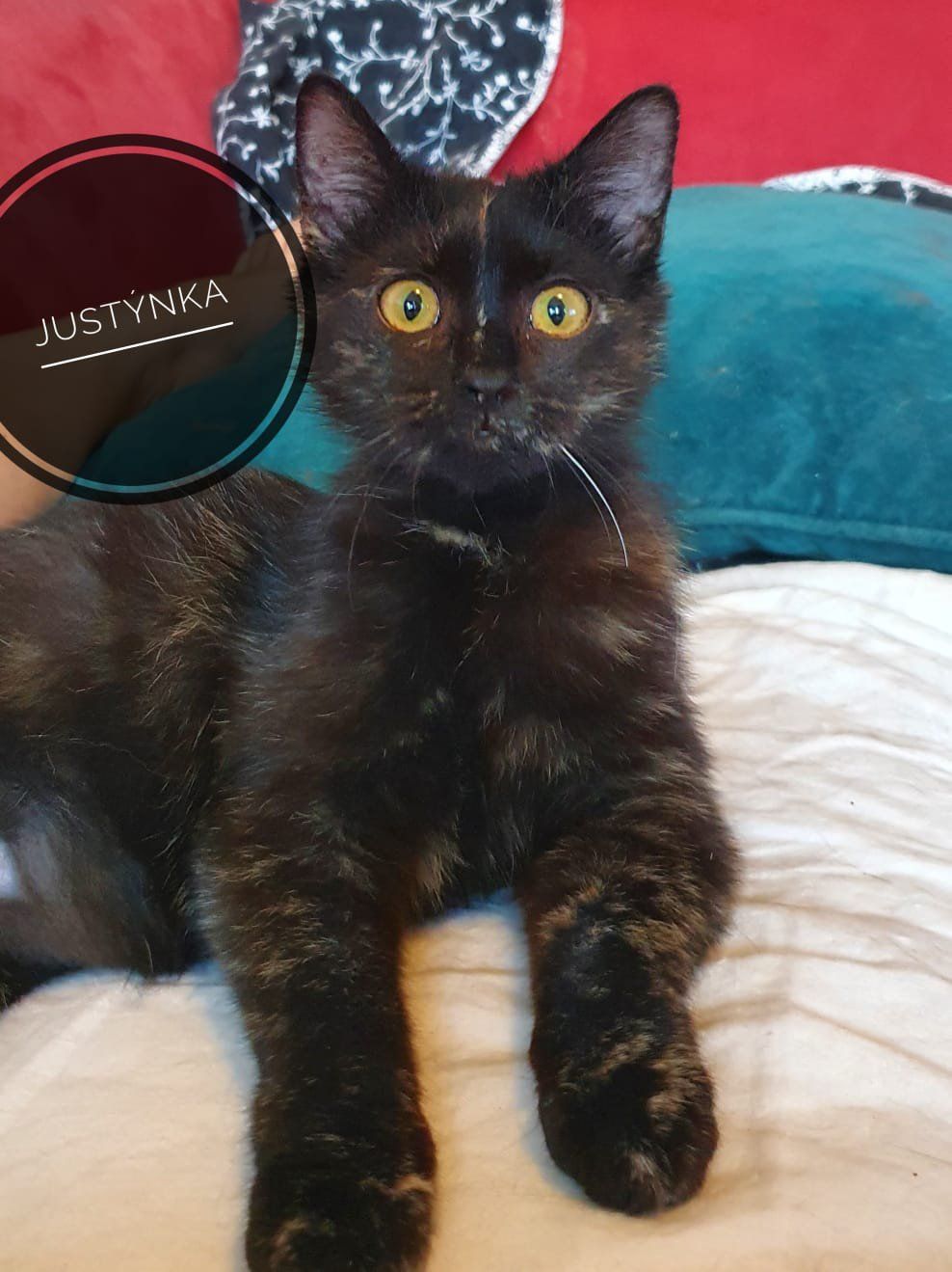 Justýnka je asi čtyřměsíční mazlivý drobeček plný lásky. Hledá domov u zodpovědné rodinky, která ji bude brát jako právoplatného člena domácnosti a nejen jako pouhého lovce myšiček. Je láskyplná, přítulná a hravá. S jinými kočičkami se snese a nějakého chlupatého parťáka určitě ocení. Umí chodit hezky na záchudek. Je FIV a FeLV negativní.