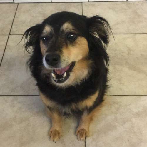 Huňatá přátelská fenka, úžasně snášenlivá, zhruba 3-4letá