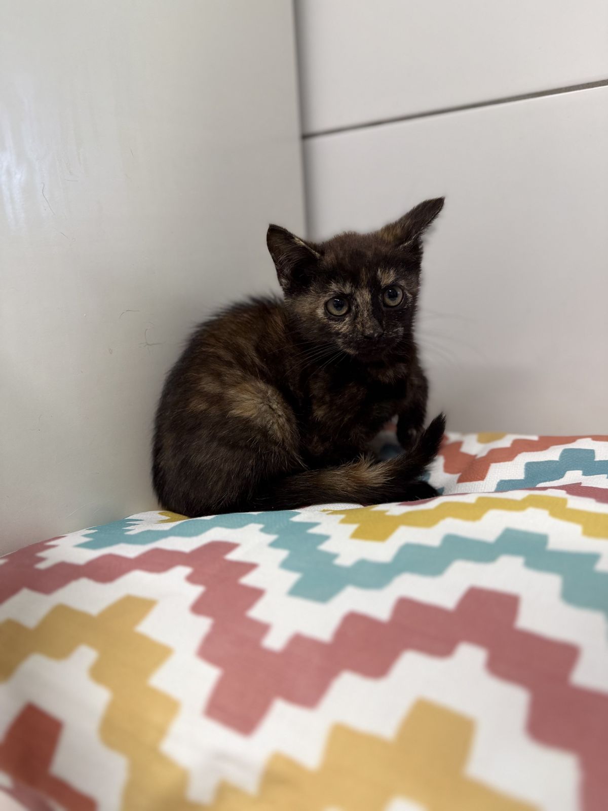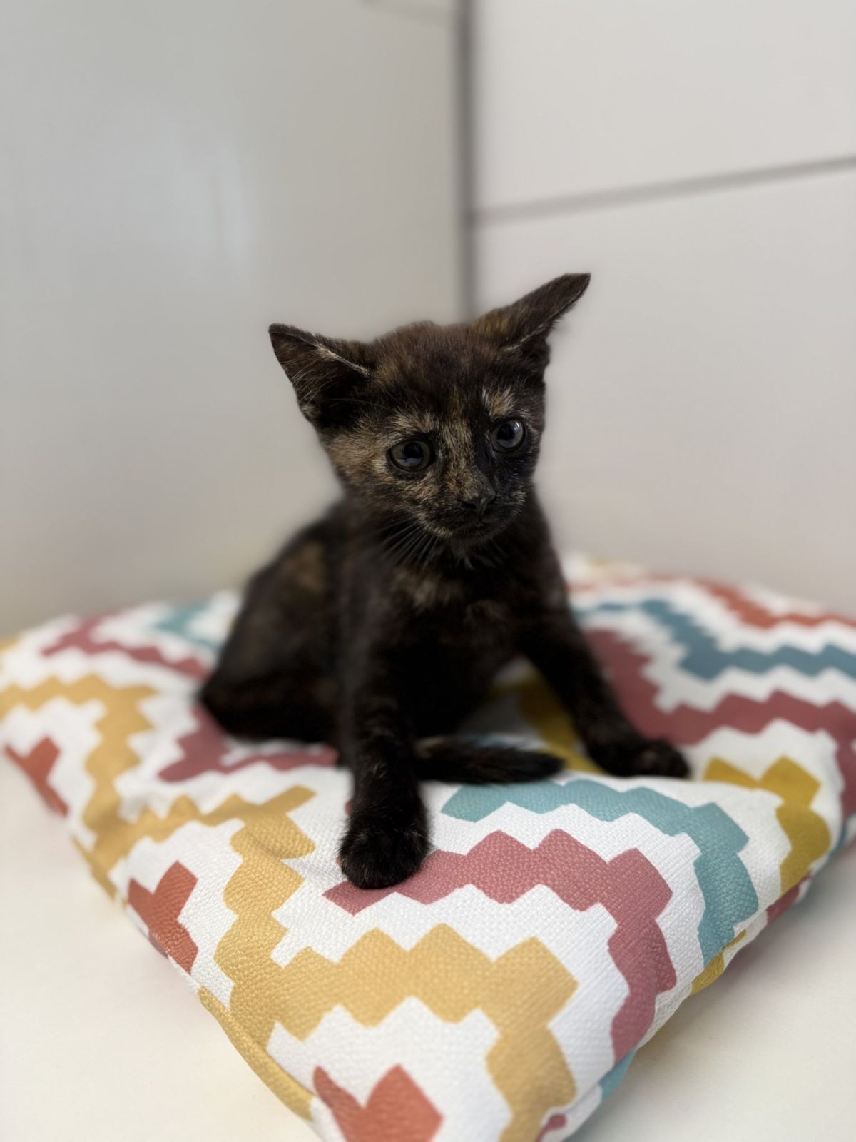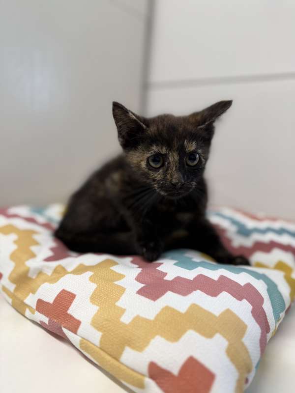 REZERVOVÁNAAhoj, já jsem malá Clea. Jsou mi asi tři měsíce a do útulku jsem přišla se svrabem a spoustou strachu. Na rozdíl od dospělých koček z naší skupiny ale nejsem tolik agresivní – spíš se bojím a schovávám. Pomalu si začínám zvykat, že člověk není nebezpečí, ale šance na lepší život. Sice mi to zatím moc nejde, ale díky svému věku mám velkou šanci, že se z bojácného kotěte stane přítulná kočičí kamarádka.