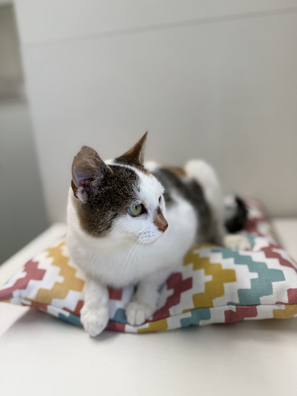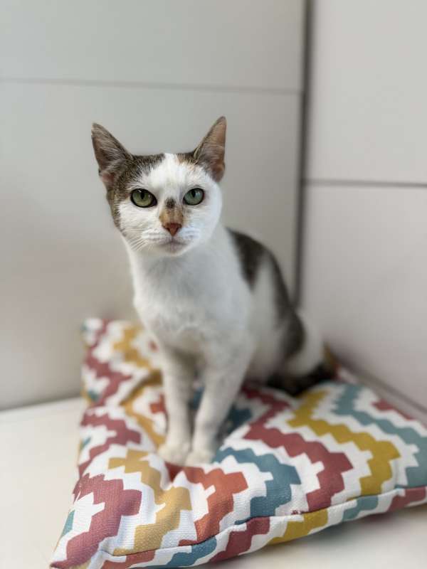 Je mi asi šest let a do útulku jsem přišla i se svými třemi koťaty – Lolou, Leonem a Lilly. Na začátku jsem na tom nebyla úplně nejlíp… byla jsem zablešená, měla jsem bolavé zuby (jeden špičák mám dokonce ulomený) a svědilo mě celé tělo i uši. Ale lidi tady se o mě hezky postarali, takže už je mi mnohem líp.