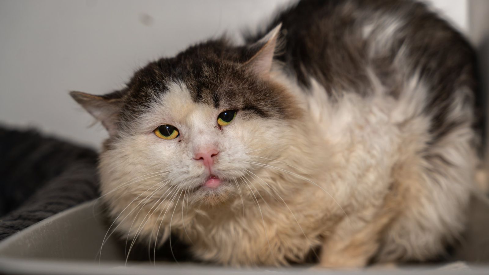 Spolu s dalšími kočičími kamarády – Obelixem, Cleopatrou, Xenou a Cézarem – jsme byli odebráni Krajskou veterinární správou z bytu hrůzy, kde nás jedna paní držela, byolo nás 25. Byly jsme v naprosto nevhodných podmínkách. Byt byl plný výkalů, zápachu a špíny. Žili jsme tam bez péče, bez léčby a bez šance na normální život.